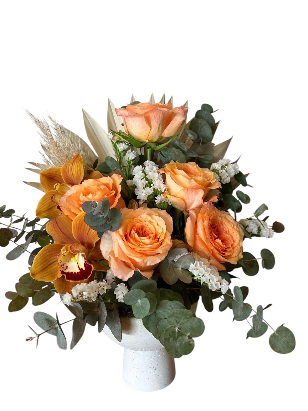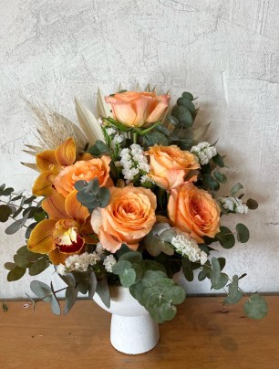 Somon güller, turuncu cymbidium orkide, okaliptus dalları ve pampas ile tasarlanan Stefanie ayaklı şık vazosu eşliğinde sevdiklerinize dört mevsim duygularınızı iletmeniz için çok güzel bir hediye seçeneğidir.